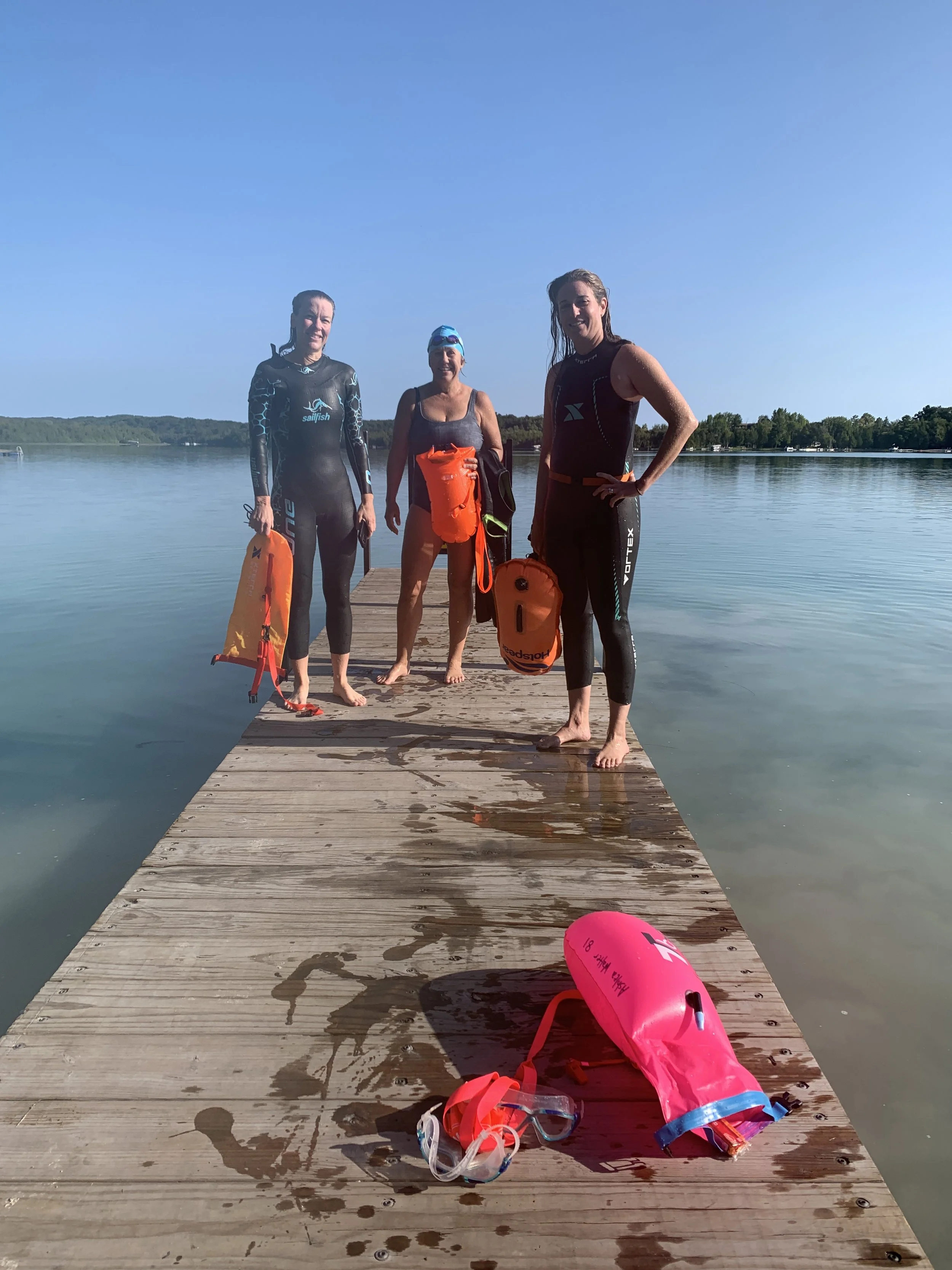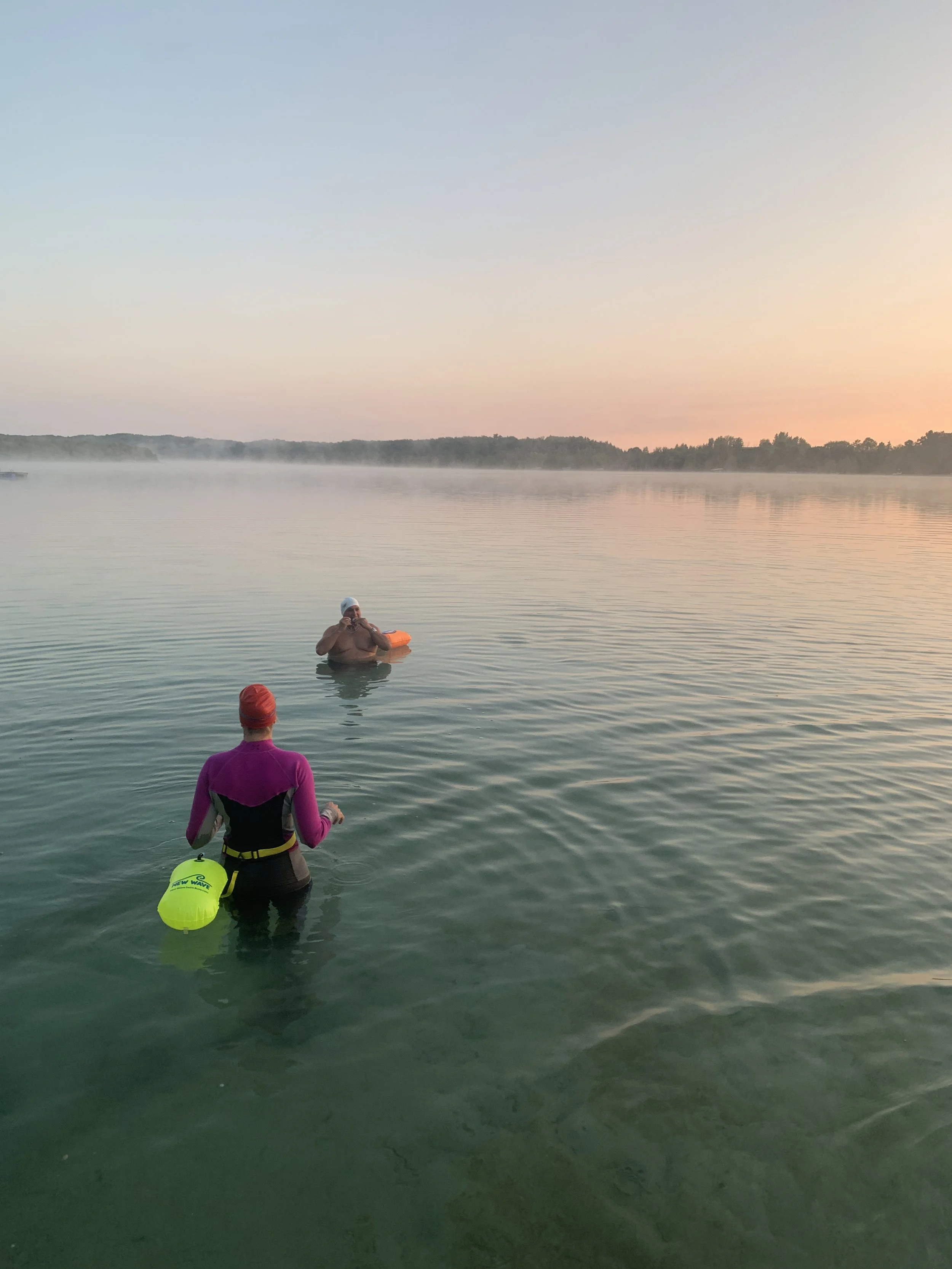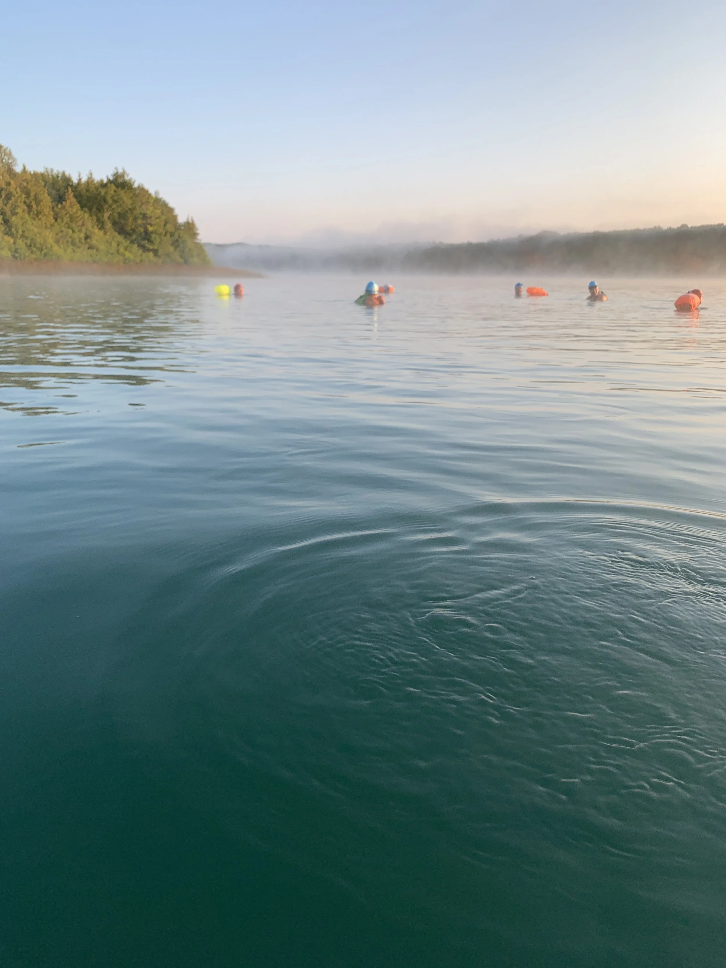 Most of our swims are early in the morning for several reasons: water is usually calmer, there are fewer boats, it’s beautiful at sunrise, and most of our swimmers work outside of the home and/or have kids at home so we need to get going earlier.